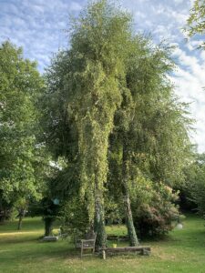 Connaissez-vous la Kent’s Cavern à Torquay dans le Devon (UK) ? Son emblème est le mammouth. Nous avions fait la visite et rapporté deux très belles peluches, le grand format que nous avons baptisé Mama Kent et le petit format, baptisé Kent Junior. Nous prenons bien soin d’eux. Or chaque fois que nous déjeunons sur la terrasse, nous sommes observés. Le grand bouleau qui nous fait face est penché vers nous et nous regarde en silence. Je crois que c’est le fantôme de l’ancêtre de Mama et Junior, ou bien c’est peut-être Papa Kent qui cherche sa famille. Il nous domine. Il est majestueux. Je pense plutôt que c’est l’esprit de toute la tribu mammouth qui veille sur nous qui sommes les gardiens de leur mémoire.